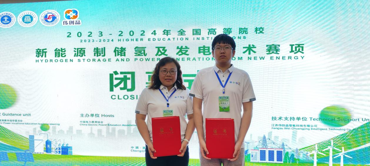 5月16日,2023-2024年全国高等院校新能源制储氢及发电技术竞赛在重庆电力高等专科学校(潼南校区)开幕。该竞赛以师生同赛方式进行,来自全国22个省市47所高校的106支队伍参加比赛。经过激烈的比拼,由我校电气工程学院田军老师指导,柳慧春老师、王兴博同学组成的参赛团队荣获全国二等奖。 本次竞赛内容紧密围绕新能源发电系统平台所具备的新能源制氢系统、氢氧燃料电池发电以及相关的技术应用设计开展,包括新能源模拟装置的测试与控制、电解系统设计测量与实施、储氢系统设计测量与实施、氢氧燃料电池特性测试分析、新能源制储氢及发电控制系统等五部分。本次大赛检验了我校新能源发电技术专业群技术技能人才的培养成效,比赛过程中,参赛选手沉着冷静、准确判断、正确处理,顺利完成不同模块所需的任务要求,以精湛的专业技能取得优异成绩。 (供稿单位:电气工程学院 初审:孟令飞 复审:刘莹 终审:汤海涛)